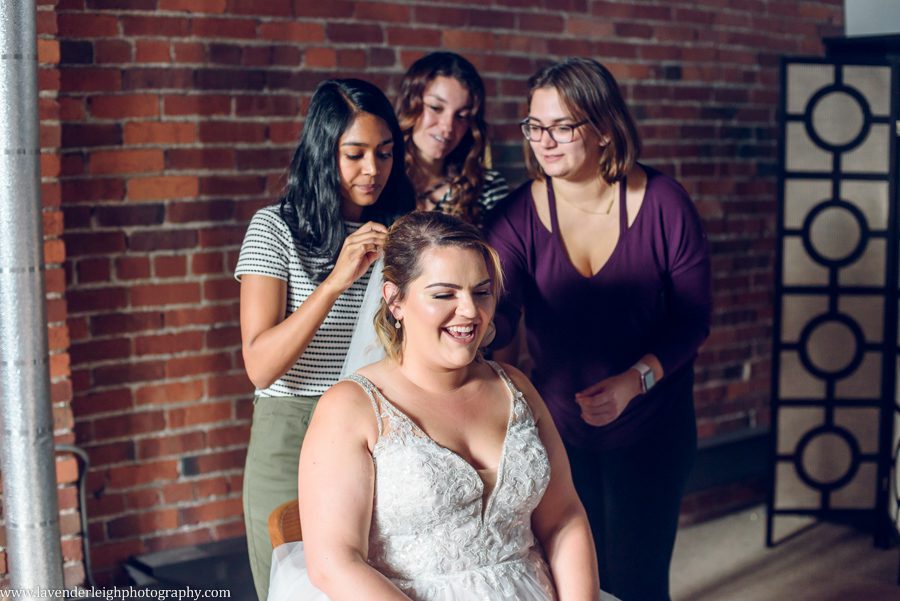 Popping my head into Meg’s getting ready room, I see her sitting in the makeup artist’s chair, her laughter lighting up the room. Meg’s smile is bright and contagious, and I can’t help but chuckle as I witness Meg’s wedding day delight.