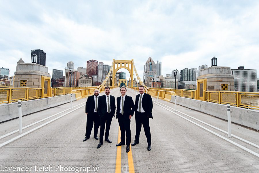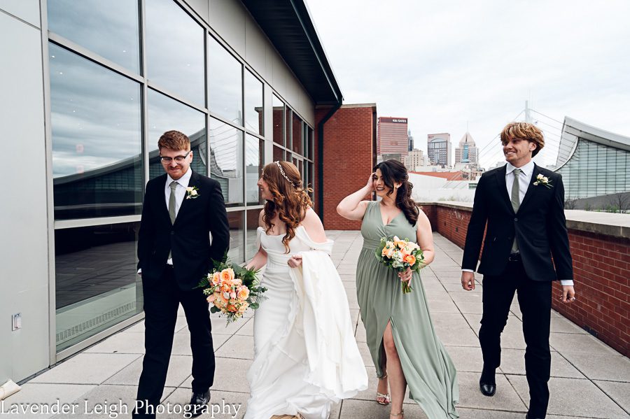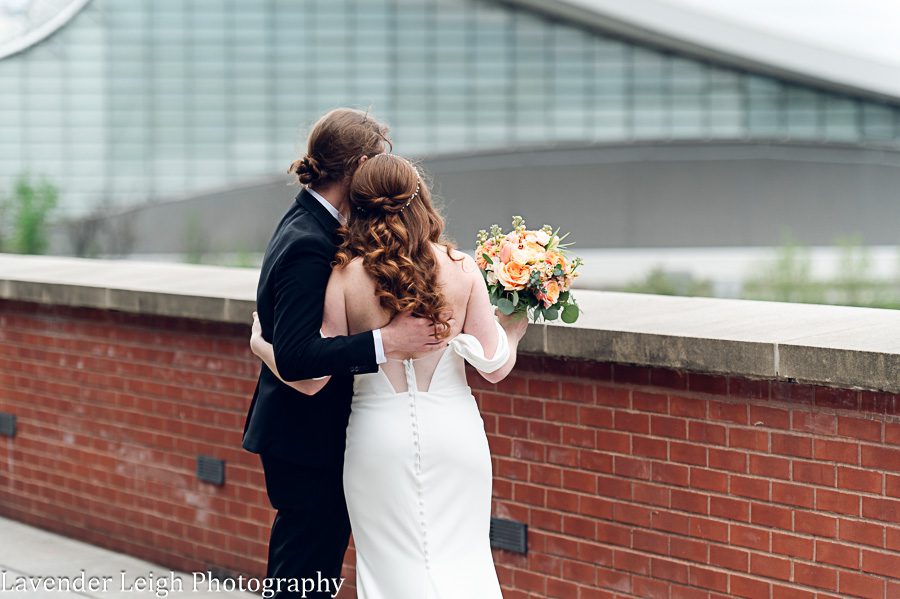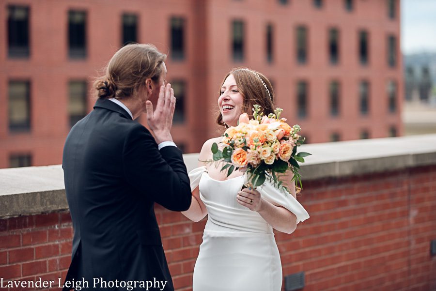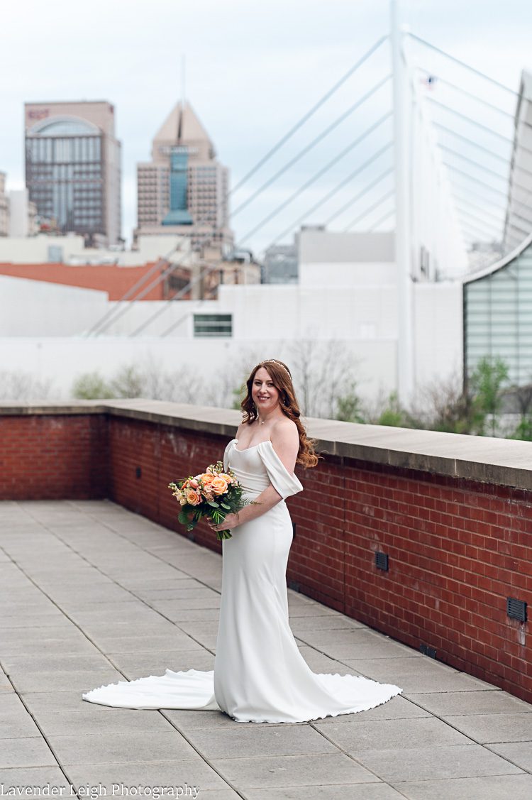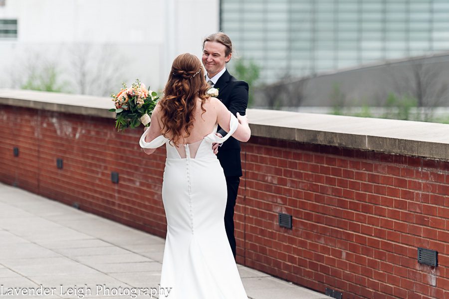Emily was a vision in her elegant and flowing off-the-shoulder wedding dress. She and Drew opted for a first look on the balcony of the Heinz History Center. The backdrop of the city skyline paled in comparison to his gorgeous bride; you could see how taken Drew was when he first saw Emily in her wedding dress!