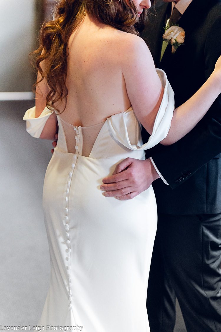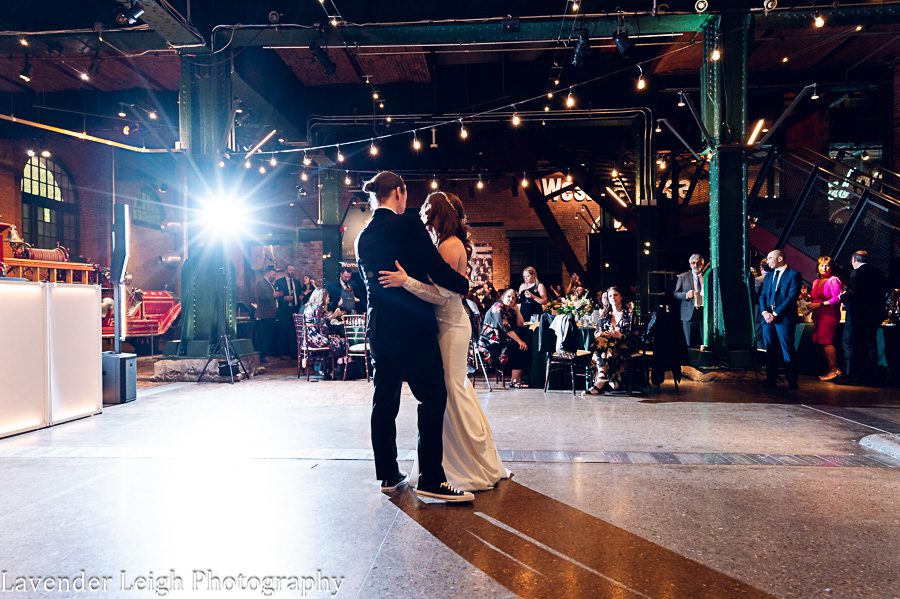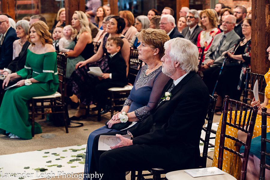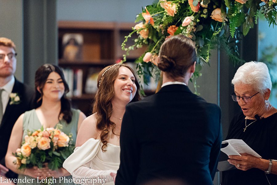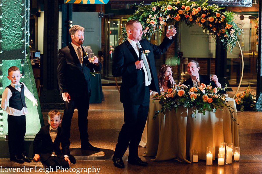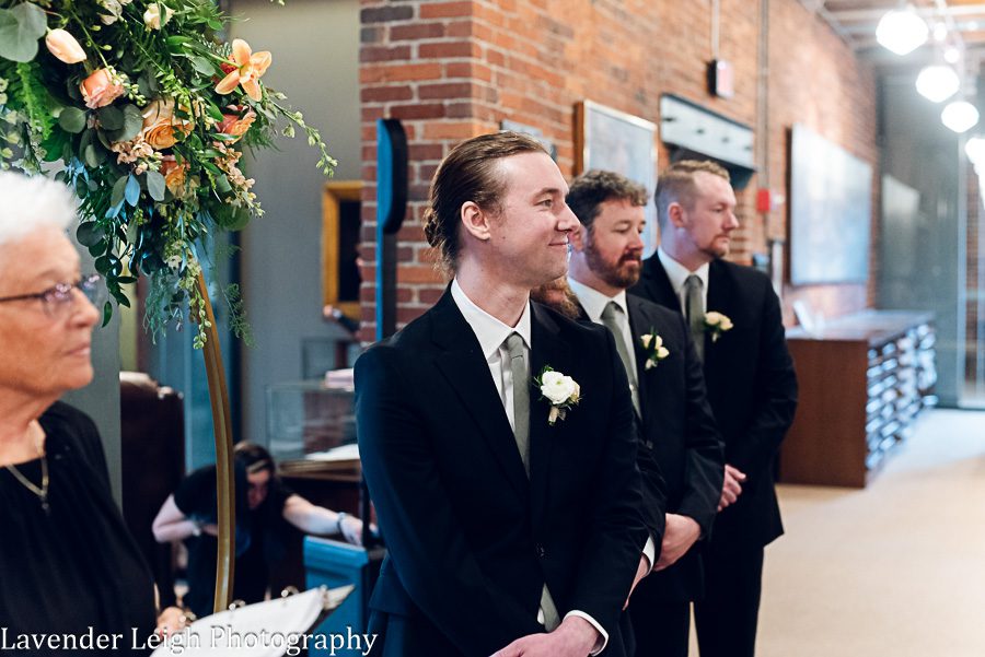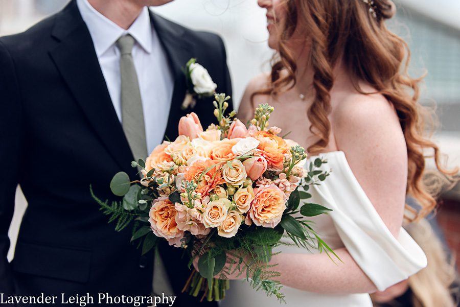 Emily was a vision in her elegant and flowing off-the-shoulder wedding dress. She and Drew opted for a first look on the balcony of the Heinz History Center. The backdrop of the city skyline paled in comparison to his gorgeous bride; you could see how taken Drew was when he first saw Emily in her wedding dress!