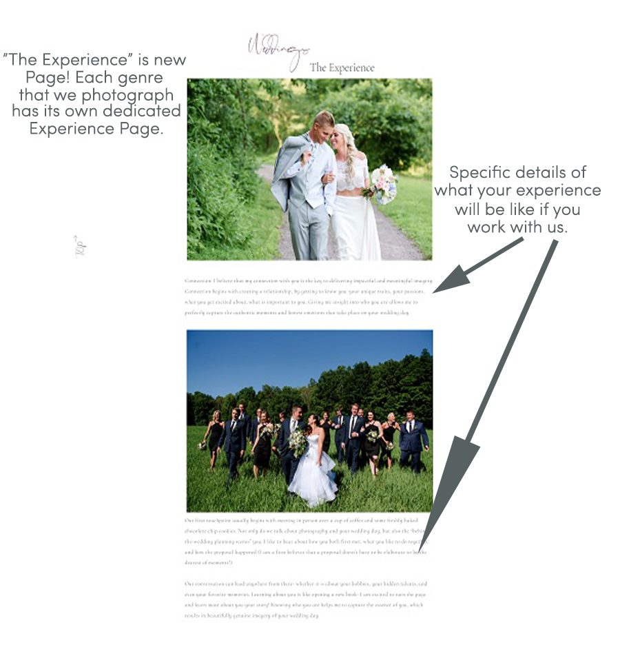 This page is similar to the “Categories” page on our previous website. Each genre (Boudoir, Weddings, Engagements, and Seniors) has its own dedicated page.