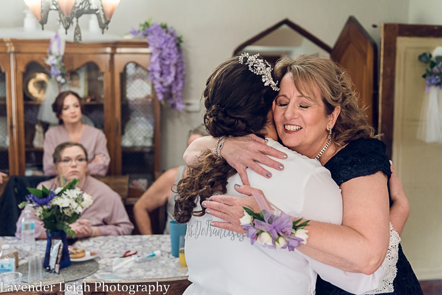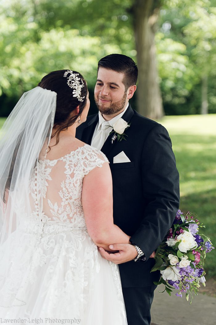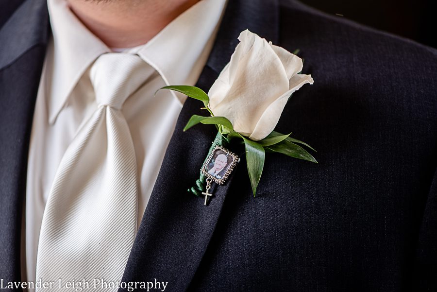 One of the things I love most about Julia and Jeff is how important their family is to them. This sentiment was reflected in their wedding details and also in noticeable moments throughout their wedding day. For example, there was a dangle charm hanging from Julia’s bouquet with pictures of her loved ones. And, Julia made it a point to be the one to slide the corsage onto the wrist of someone who is close to her, her grandmother’s foster daughter, prior to the ceremony. Not only did Julia have a father-daughter dance, but she also had a mother-daughter dance. In the same manner, Jeff wore a memory pin on his suit, and his mother pinned his boutonniere onto him once he arrived at the church.