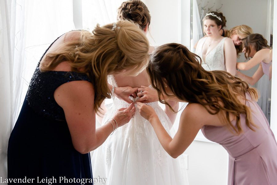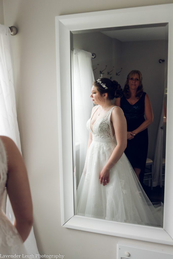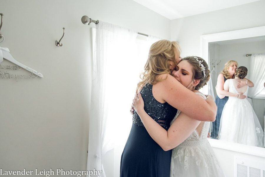 As Morgan’s mother zipped up her wedding dress, I could see happy tears welling up in both of their eyes. Morgan looked absolutely stunning in her wedding dress, and I could see the pride in her mother’s expression as she took a step back to look at her lovely daughter. Fanning her face, Morgan took a deep breath, laughed, and said “I can’t cry, I will ruin my makeup!” To which I jokingly replied “We photographers love capturing emotion! Cry away!”