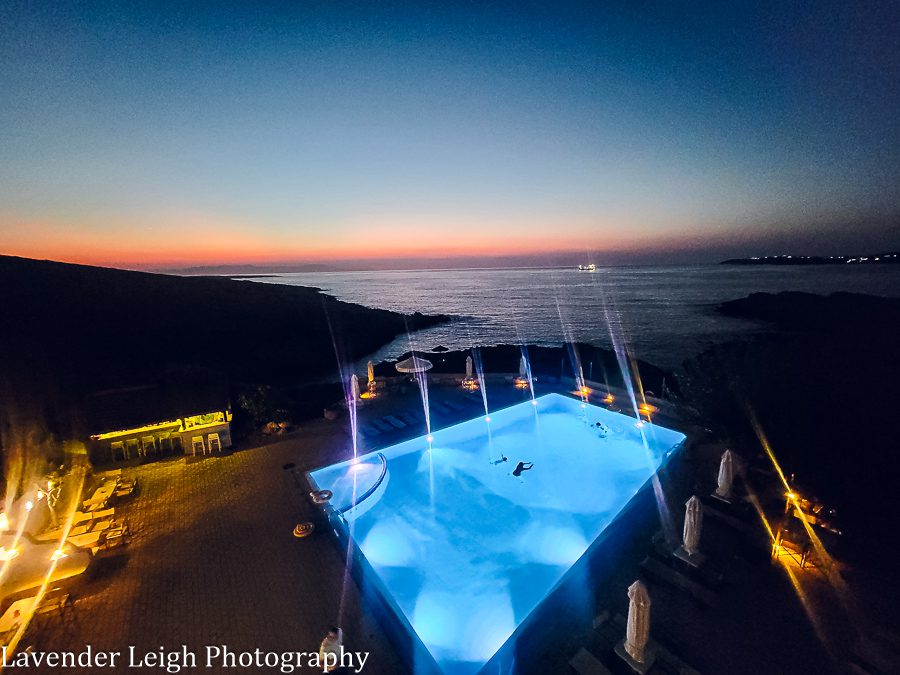 The entryway to Giorgi’s Blue Apartments.The quaint sea cove at Giorgi’s Blue Apartments.Sunset at the pool. The picture above and also below are cell snaps from our balcony. You can see the sea access close to the pool. Below are people having a placid night swim in the pool.Sunset view from our balcony.A container ship silently floating on the sea at night, the view from our balcony.