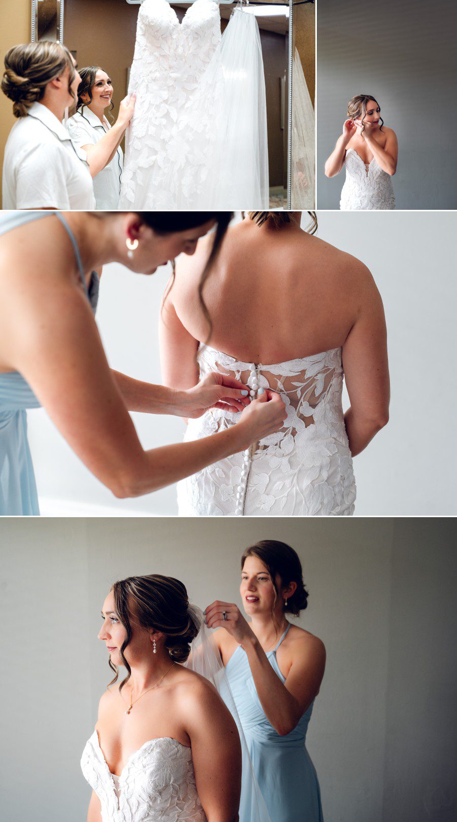 As the bridesmaids were flurrying around in their pretty periwinkle dresses, we tucked Katie into a quiet room for her to put on her wedding dress. She was calm, cool and collected, and the second she was buttoned up in her dress, a wave of excitement swept through the room, and her beautiful blue eyes beamed with anticipation of what was to come that day!